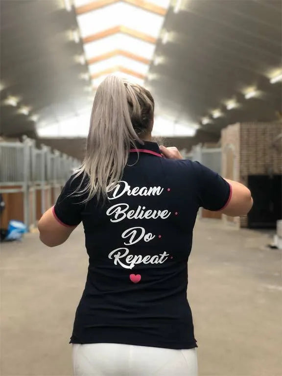 Made of a lovely, good quality stretchy fabric with a polo collar and slits at the bottom/side. The By Jill logo is embroidered in a heart on the front and the back says #Dream, #Believe #Do #Repeat.